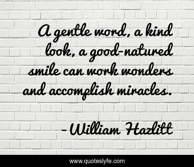 This page presents the quote "A gentle word, a kind look, a good-natured smile can work wonders and accomplish miracles.". Author of this quote is William Hazlitt. This quote is about smile, kind, look, happiness,.