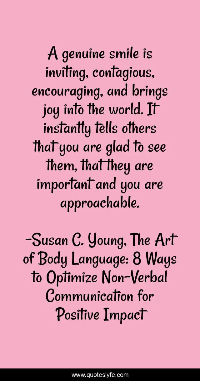 "Susan C. Young, The Art of Body Language: 8 Ways to Optimize Non-Verbal Communication for Positive Impact Quotes." Quoteslyfe.com, 2025. Sat. 06 Dec. 2025. <https://www.quoteslyfe.com/quote/A-genuine-smile-is-inviting-contagious-encouraging-233506>.