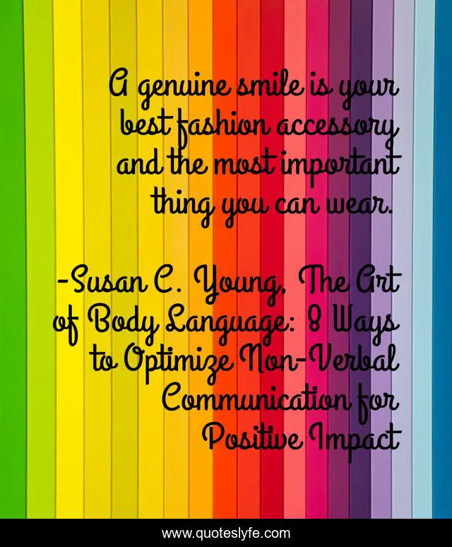 "Susan C. Young, The Art of Body Language: 8 Ways to Optimize Non-Verbal Communication for Positive Impact Quotes." Quoteslyfe.com, 2025. Sat. 06 Dec. 2025. <https://www.quoteslyfe.com/quote/A-genuine-smile-is-your-best-fashion-233514>.