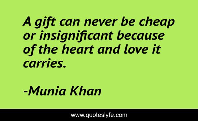 This page presents the quote "A gift can never be cheap or insignificant because of the heart and love it carries.". Author of this quote is Munia Khan. This quote is about heart, because, love, gift, insignificant, cheap, bear, gift-of-life, gifts,.