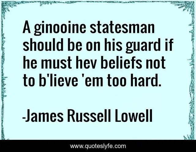 This page presents the quote "A ginooine statesman should be on his guard if he must hev beliefs not to b'lieve 'em too hard.". Author of this quote is James Russell Lowell. .