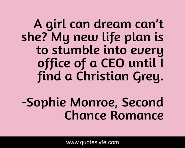 This page presents the quote "A girl can dream can’t she? My new life plan is to stumble into every office of a CEO until I find a Christian Grey.". Author of this quote is Sophie Monroe, Second Chance Romance. This quote is about funny, comedy, humor, dream,.