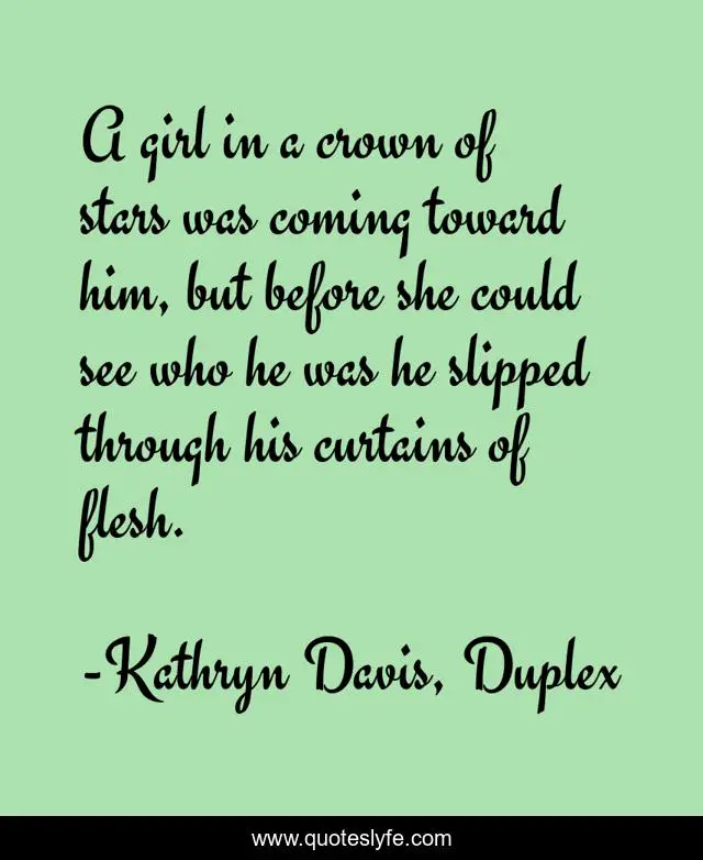 This page presents the quote "A girl in a crown of stars was coming toward him, but before she could see who he was he slipped through his curtains of flesh.". Author of this quote is Kathryn Davis, Duplex. This quote is about girl, curtails, crown, stars, flesh,.