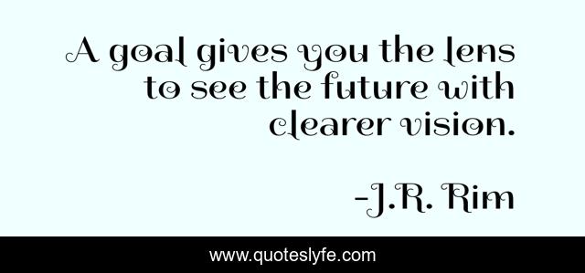 This page presents the quote "A goal gives you the lens to see the future with clearer vision.". Author of this quote is J.R. Rim. This quote is about lens, goal, clear, project, see, future, sight, vision,.