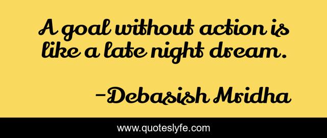 This page presents the quote "A goal without action is like a late night dream.". Author of this quote is Debasish Mridha. This quote is about a-goal, a-goal-without-action, oscar-wilde, philosophy, debasish-mridha, quotes, miraboli, debasish-mridha-md, inspirational,.
