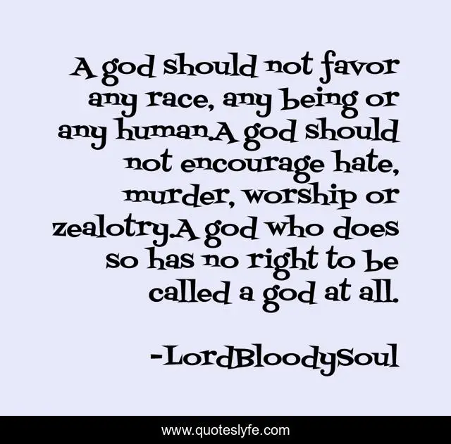 This page presents the quote "A god should not favor any race, any being or any human.A god should not encourage hate, murder, worship or zealotry.A god who does so has no right to be called a god at all.". Author of this quote is LordBloodySoul. This quote is about god, religion, gods, philosophy, quotes, quote, lordbloodysoul, philosophy-of-religion, religious,.