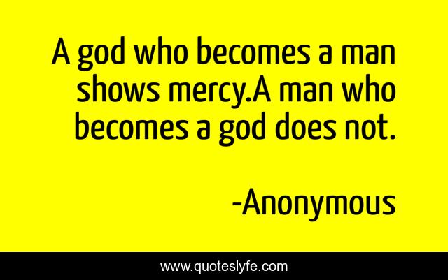 This page presents the quote "A god who becomes a man shows mercy.A man who becomes a god does not.". Author of this quote is Anonymous. This quote is about mercy, mankind, religion,.