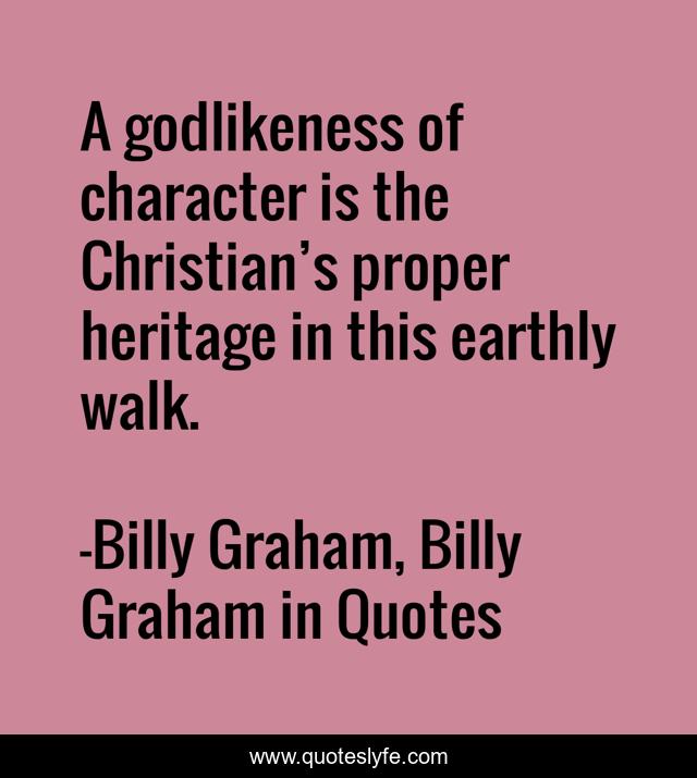 This page presents the quote "A godlikeness of character is the Christian’s proper heritage in this earthly walk.". Author of this quote is Billy Graham, Billy Graham in Quotes. This quote is about character, billy-graham,.