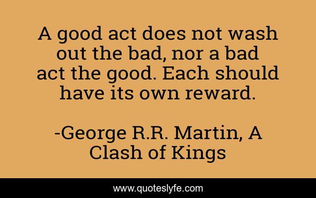 This page presents the quote "A good act does not wash out the bad, nor a bad act the good. Each should have its own reward.". Author of this quote is George R.R. Martin, A Clash of Kings. This quote is about justice, crime, redemption, morality,.