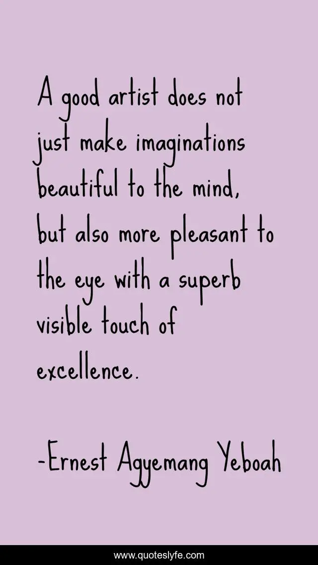 This page presents the quote "A good artist does not just make imaginations beautiful to the mind, but also more pleasant to the eye with a superb visible touch of excellence.". Author of this quote is Ernest Agyemang Yeboah. This quote is about art, creativity, beauty-of-nature, vision-and-realities, imagination, artistic-creativity,.