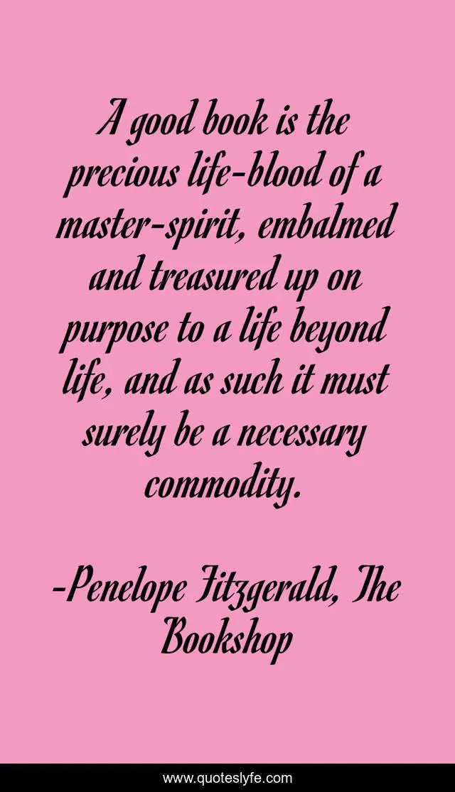 This page presents the quote "A good book is the precious life-blood of a master-spirit, embalmed and treasured up on purpose to a life beyond life, and as such it must surely be a necessary commodity.". Author of this quote is Penelope Fitzgerald, The Bookshop. This quote is about necessities, treasures, books, spiritual-life, reading, purpose-of-life,.