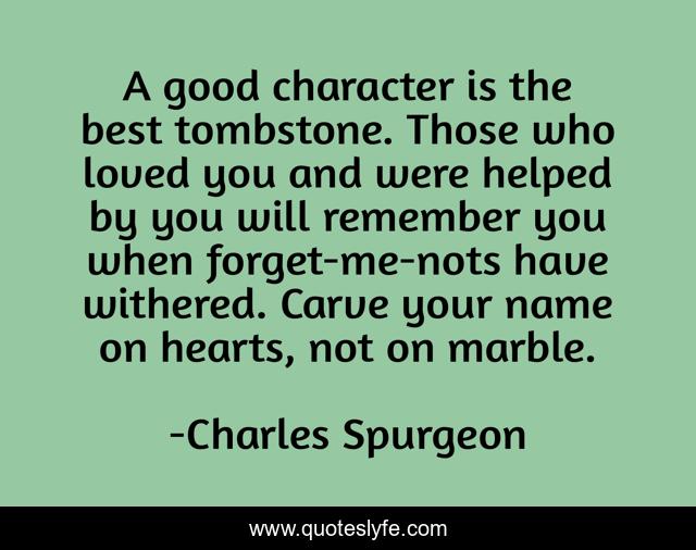 This page presents the quote "A good character is the best tombstone. Those who loved you and were helped by you will remember you when forget-me-nots have withered. Carve your name on hearts, not on marble.". Author of this quote is Charles Spurgeon. This quote is about good, character, remember,.