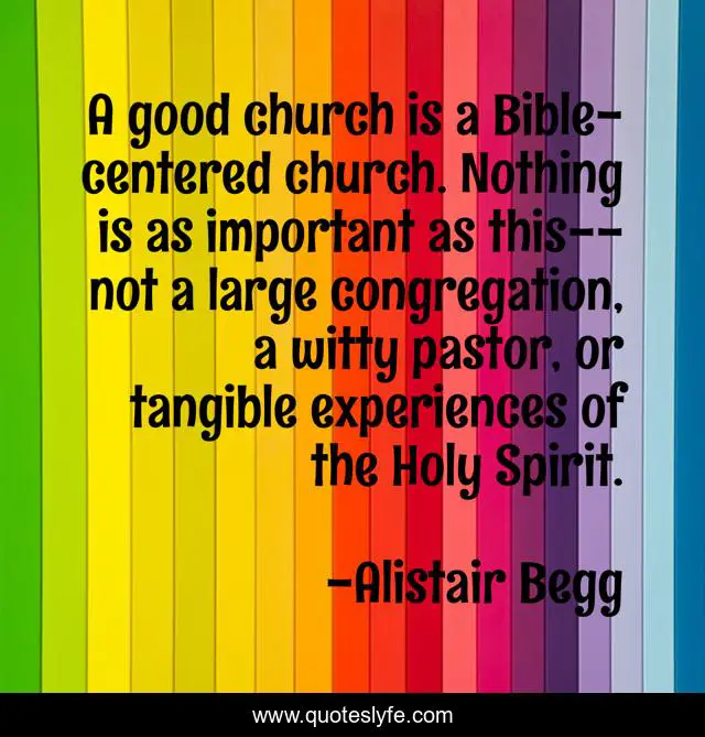 This page presents the quote "A good church is a Bible-centered church. Nothing is as important as this--not a large congregation, a witty pastor, or tangible experiences of the Holy Spirit.". Author of this quote is Alistair Begg. This quote is about bible, christianity, holy-spirit, church,.