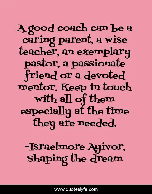 This page presents the quote "A good coach can be a caring parent, a wise teacher, an exemplary pastor, a passionate friend or a devoted mentor. Keep in touch with all of them especially at the time they are needed.". Author of this quote is Israelmore Ayivor, Shaping the dream. This quote is about coach, exemplary, devote, preacher, touch, need, food-for-thought, companionship, counselors,.
