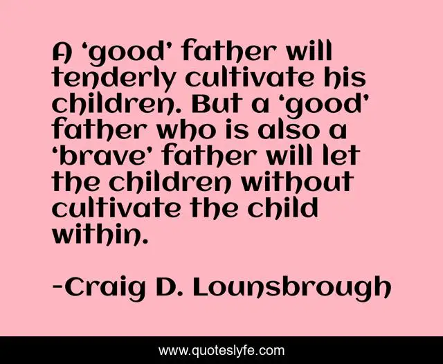This page presents the quote "A ‘good’ father will tenderly cultivate his children. But a ‘good’ father who is also a ‘brave’ father will let the children without cultivate the child within.". Author of this quote is Craig D. Lounsbrough. This quote is about fatherhood, brave, raise, parent, child, father, upbringing, raising-children, parenting,.