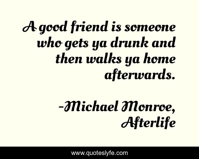 This page presents the quote "A good friend is someone who gets ya drunk and then walks ya home afterwards.". Author of this quote is Michael Monroe, Afterlife. This quote is about afterlife, science-fiction, post-apocalyptic, western, dystopian-fiction, friendship,.