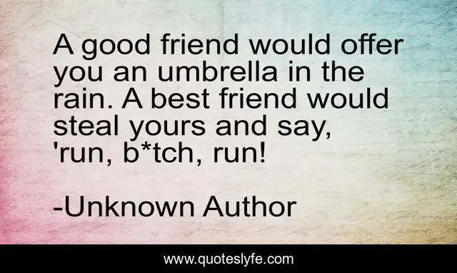This page presents the quote "A good friend would offer you an umbrella in the rain. A best friend would steal yours and say, 'run, b*tch, run!". Author of this quote is Unknown Author. This quote is about friendship, humor,.