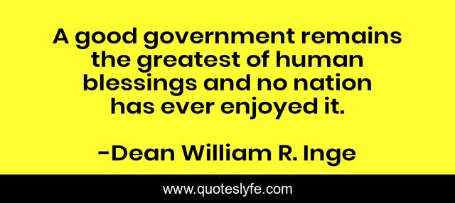 This page presents the quote "A good government remains the greatest of human blessings and no nation has ever enjoyed it.". Author of this quote is Dean William R. Inge. This quote is about rule, government,.