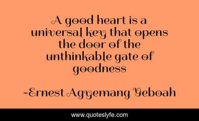 This page presents the quote "A good heart is a universal key that opens the door of the unthinkable gate of goodness". Author of this quote is Ernest Agyemang Yeboah. This quote is about solving-your-problems, life, goodness, a-good-heart, giving, do-good, be-good, learn-to-give, blessings-in-giving,.