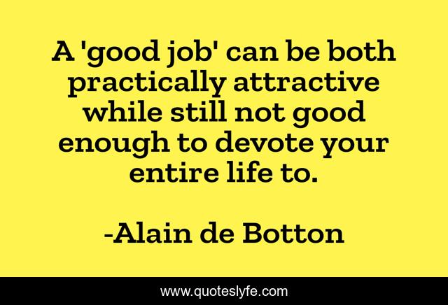 This page presents the quote "A 'good job' can be both practically attractive while still not good enough to devote your entire life to.". Author of this quote is Alain de Botton. This quote is about work-life-balance, life, jobs, work, good-jobs, employment,.