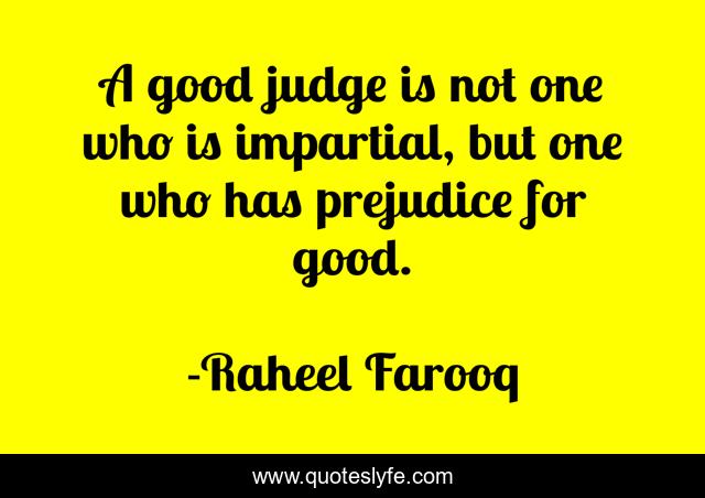 This page presents the quote "A good judge is not one who is impartial, but one who has prejudice for good.". Author of this quote is Raheel Farooq. This quote is about good, decision, impartiality, prejudices, critic, logic, judge, law, judgment,.
