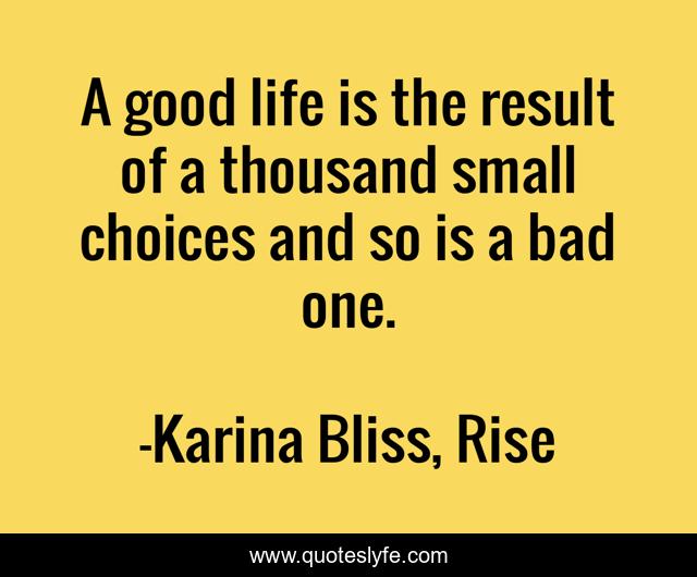 This page presents the quote "A good life is the result of a thousand small choices and so is a bad one.". Author of this quote is Karina Bliss, Rise. This quote is about advice, life,.