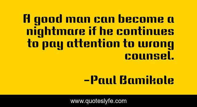 This page presents the quote "A good man can become a nightmare if he continues to pay attention to wrong counsel.". Author of this quote is Paul Bamikole. This quote is about counsel, attention, wrong, man,.