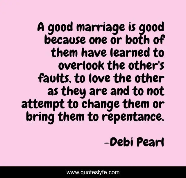 This page presents the quote "A good marriage is good because one or both of them have learned to overlook the other's faults, to love the other as they are and to not attempt to change them or bring them to repentance.". Author of this quote is Debi Pearl. .