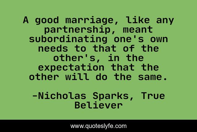 This page presents the quote "A good marriage, like any partnership, meant subordinating one's own needs to that of the other's, in the expectation that the other will do the same.". Author of this quote is Nicholas Sparks, True Believer. This quote is about marriage, cooperation,.