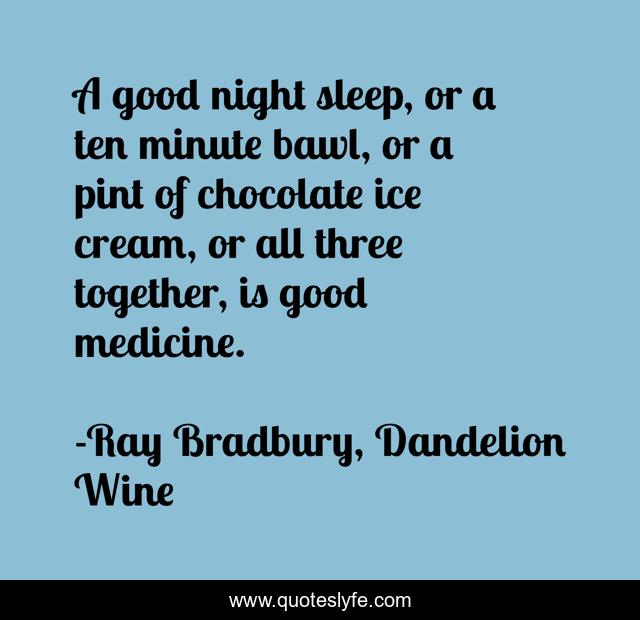 This page presents the quote "A good night sleep, or a ten minute bawl, or a pint of chocolate ice cream, or all three together, is good medicine.". Author of this quote is Ray Bradbury, Dandelion Wine. .