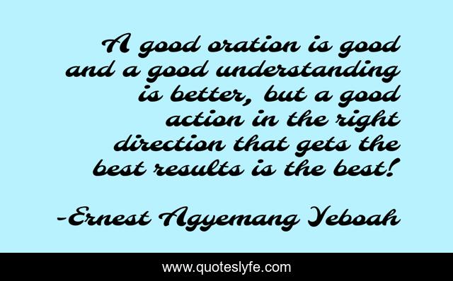 This page presents the quote "A good oration is good and a good understanding is better, but a good action in the right direction that gets the best results is the best!". Author of this quote is Ernest Agyemang Yeboah. This quote is about right-action, results, understanding, speech, oration, action,.
