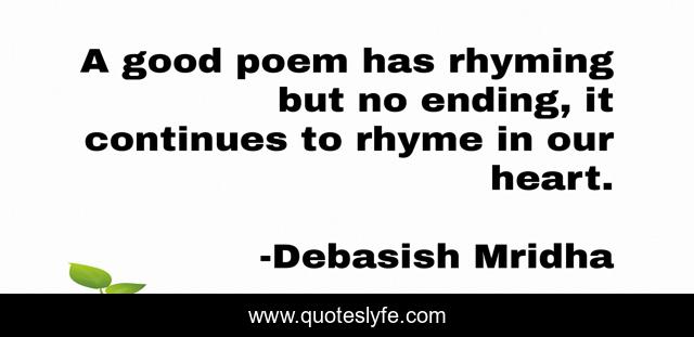 This page presents the quote "A good poem has rhyming but no ending, it continues to rhyme in our heart.". Author of this quote is Debasish Mridha. This quote is about heart, life, rhyming, love, knowledge, poem, inspirational, intelligence, philosophy,.