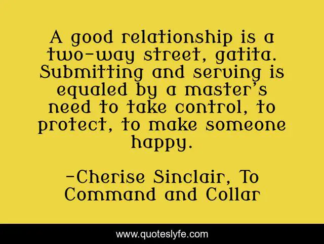 This page presents the quote "A good relationship is a two-way street, gatita. Submitting and serving is equaled by a master’s need to take control, to protect, to make someone happy.". Author of this quote is Cherise Sinclair, To Command and Collar. This quote is about erotica, to-command-and-collar, cherise-sinclair,.