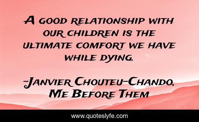 This page presents the quote "A good relationship with our children is the ultimate comfort we have while dying.". Author of this quote is Janvier Chouteu-Chando, Me Before Them. This quote is about confidence, philosophy, success, positive, motivational, wisdom, romance, spirituality, optimistic,.