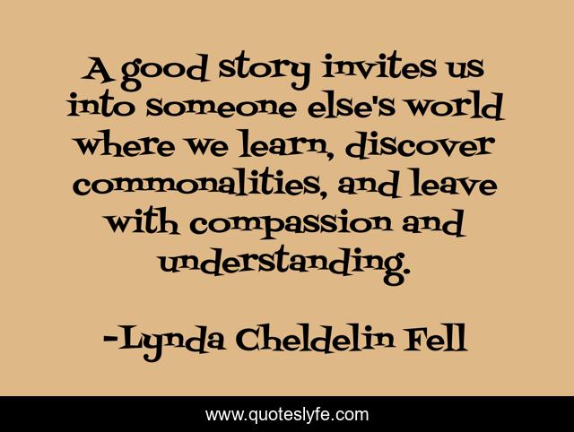 This page presents the quote "A good story invites us into someone else's world where we learn, discover commonalities, and leave with compassion and understanding.". Author of this quote is Lynda Cheldelin Fell. This quote is about grief-diaries, real-life-diaries, compassion, story, understanding, stories, learn, reading,.