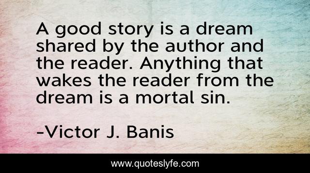 This page presents the quote "A good story is a dream shared by the author and the reader. Anything that wakes the reader from the dream is a mortal sin.". Author of this quote is Victor J. Banis. This quote is about enthusiasm, reading, inspirational, writing,.