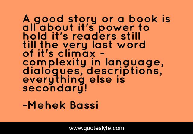 This page presents the quote "A good story or a book is all about it's power to hold it's readers still till the very last word of it's climax - complexity in language, dialogues, descriptions, everything else is secondary!". Author of this quote is Mehek Bassi. This quote is about story, description, language, climax, detail, book,.