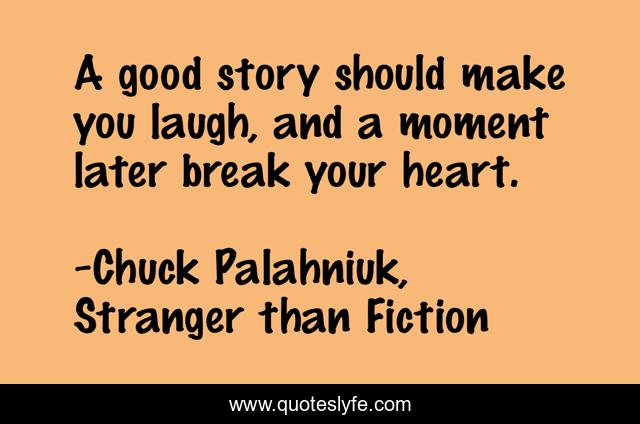 This page presents the quote "A good story should make you laugh, and a moment later break your heart.". Author of this quote is Chuck Palahniuk, Stranger than Fiction. This quote is about stories, pathos,.