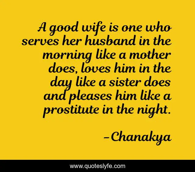 This page presents the quote "A good wife is one who serves her husband in the morning like a mother does, loves him in the day like a sister does and pleases him like a prostitute in the night.". Author of this quote is Chanakya. This quote is about sister, good, mother,.