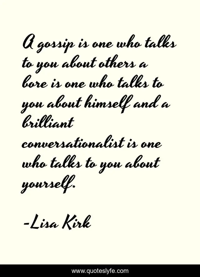 This page presents the quote "A gossip is one who talks to you about others a bore is one who talks to you about himself and a brilliant conversationalist is one who talks to you about yourself.". Author of this quote is Lisa Kirk. This quote is about control, self,.