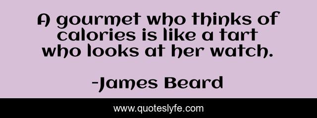 This page presents the quote "A gourmet who thinks of calories is like a tart who looks at her watch.". Author of this quote is James Beard. This quote is about food, humor,.