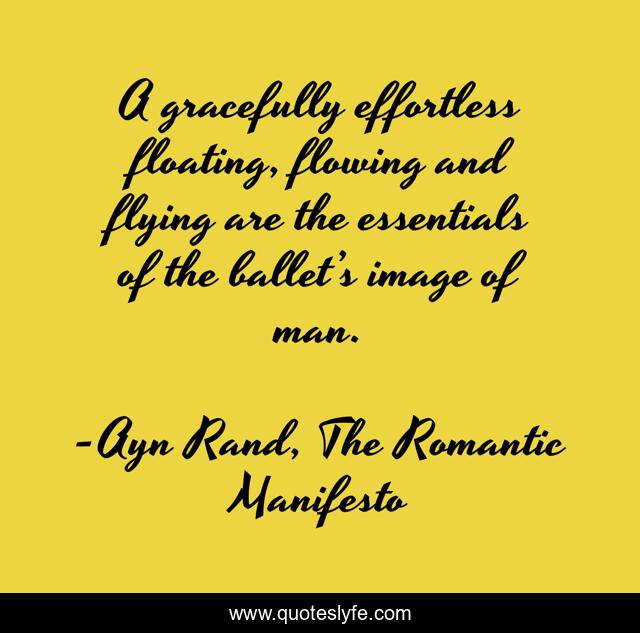 This page presents the quote "A gracefully effortless floating, flowing and flying are the essentials of the ballet’s image of man.". Author of this quote is Ayn Rand, The Romantic Manifesto. This quote is about ayn-rand, dance, art,.