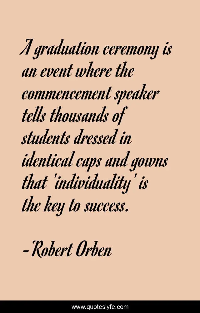 This page presents the quote "A graduation ceremony is an event where the commencement speaker tells thousands of students dressed in identical caps and gowns that 'individuality' is the key to success.". Author of this quote is Robert Orben. This quote is about key to success, success, key,.