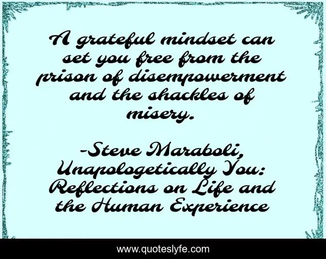 This page presents the quote "A grateful mindset can set you free from the prison of disempowerment and the shackles of misery.". Author of this quote is Steve Maraboli, Unapologetically You: Reflections on Life and the Human Experience. This quote is about gratitude, life, letting-go, appreciation, inspirational, enthusiasm, happiness,.