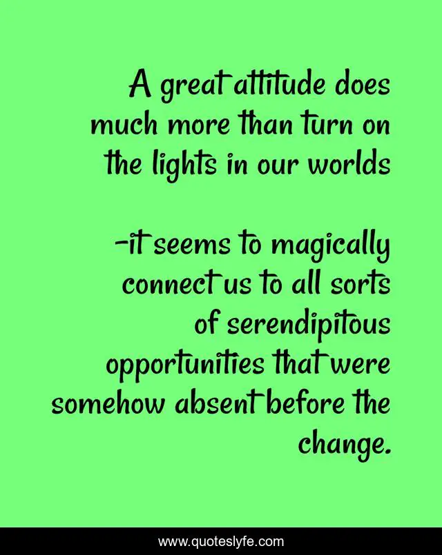 This page presents the quote "A great attitude does much more than turn on the lights in our worlds". Author of this quote is it seems to magically connect us to all sorts of serendipitous opportunities that were somehow absent before the change.. .