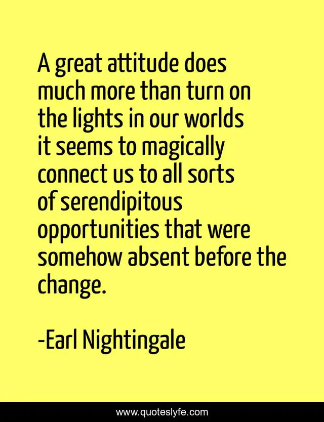 This page presents the quote "A great attitude does much more than turn on the lights in our worlds it seems to magically connect us to all sorts of serendipitous opportunities that were somehow absent before the change.". Author of this quote is Earl Nightingale. This quote is about great, change, opportunities,.