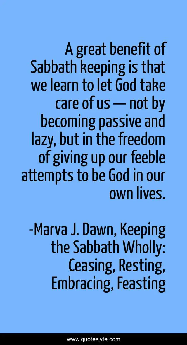 This page presents the quote "A great benefit of Sabbath keeping is that we learn to let God take care of us — not by becoming passive and lazy, but in the freedom of giving up our feeble attempts to be God in our own lives.". Author of this quote is Marva J. Dawn, Keeping the Sabbath Wholly: Ceasing, Resting, Embracing, Feasting. .