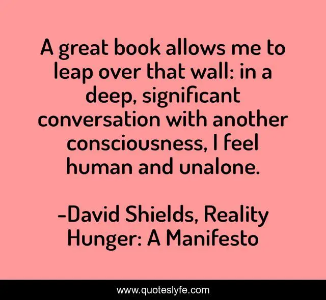 This page presents the quote "A great book allows me to leap over that wall: in a deep, significant conversation with another consciousness, I feel human and unalone.". Author of this quote is David Shields, Reality Hunger: A Manifesto. This quote is about literature, reading,.