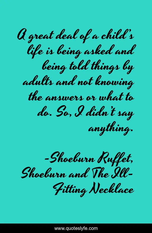 This page presents the quote "A great deal of a child’s life is being asked and being told things by adults and not knowing the answers or what to do. So, I didn’t say anything.". Author of this quote is Shoeburn Ruffet, Shoeburn and The Ill-Fitting Necklace. This quote is about mystery, middle-grade, humor, children, fiction,.