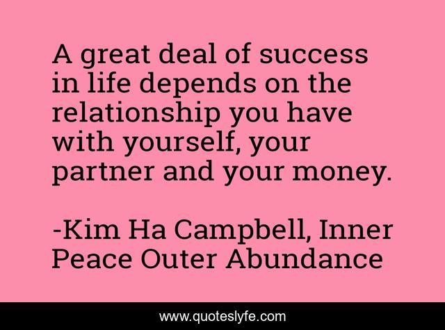 This page presents the quote "A great deal of success in life depends on the relationship you have with yourself, your partner and your money.". Author of this quote is Kim Ha Campbell, Inner Peace Outer Abundance. This quote is about relationships, life, success, money, motivation, kim-ha-campbell, inspiration,.